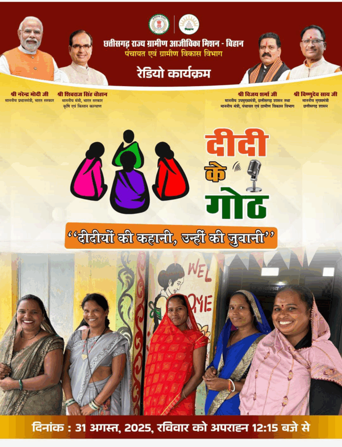 सीईओ जिला पंचायत एवं प्रभारी कलेक्टर श्री प्रतीक जैन द्वारा दीदी के गोठ रेडियो कार्यक्रम का व्यापक प्रचार-प्रसार कर उक्त कार्यक्रम में स्व-सहायता समूहों की दीदियों की अधिकाधिक सहभागिता सुनिश्चित किए जाने के निर्देश संबंधित अधिकारियों को दिए गए हैं। वहीं उक्त कार्यक्रम में जिले के स्व-सहायता समूहों की ज्यादा से ज्यादा दीदियों को उपस्थित होने का आग्रह किया गया है।
